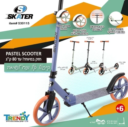 קורקינט 2 גלגלי ם גדולים PU 200MM בעל גלגלי ABEC-7 מקצועיים. עד משקל נשיאה מקסימלי 100 ק"ג ,דק אלומיניום ,גובה מתכוונן. בלם אחורי